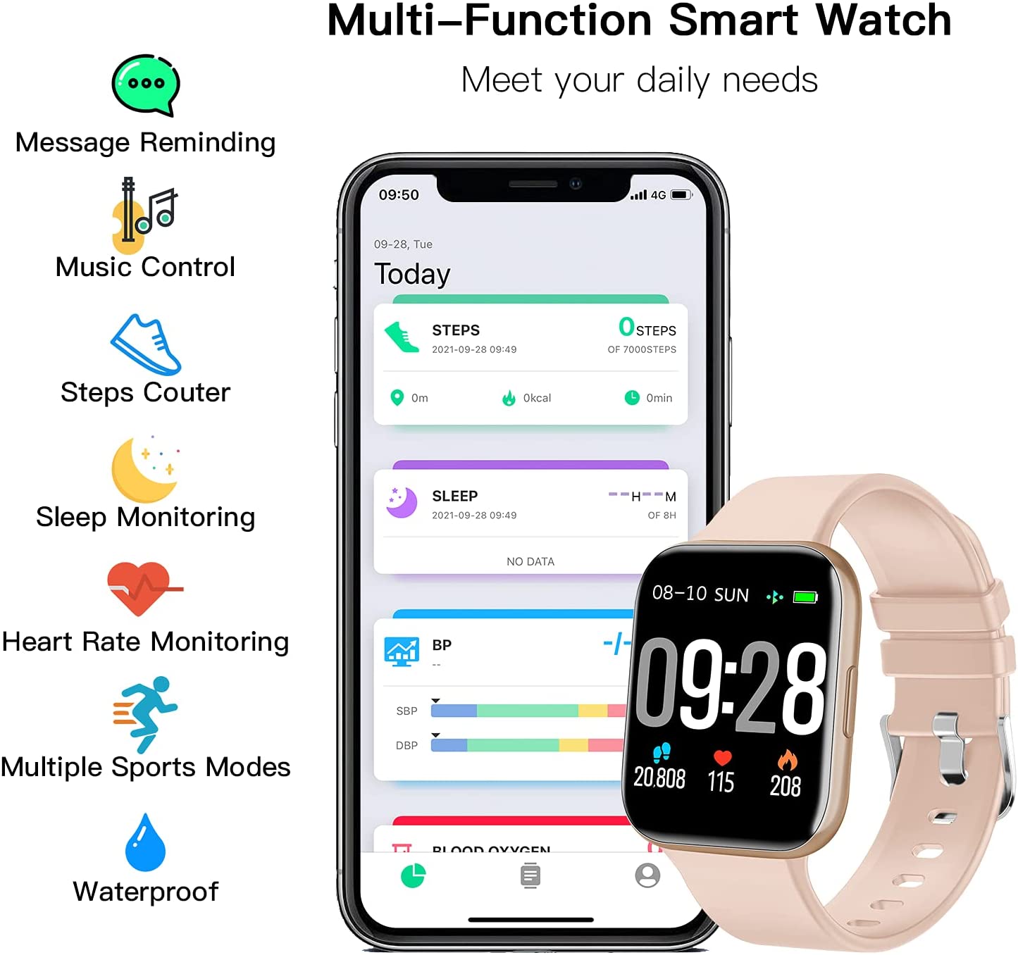 | Supports | Fitness Tracker, Weather, Sleep Monitor, Phone, Alarm, Pedometer, Camera, Heart Rate Monitor |
