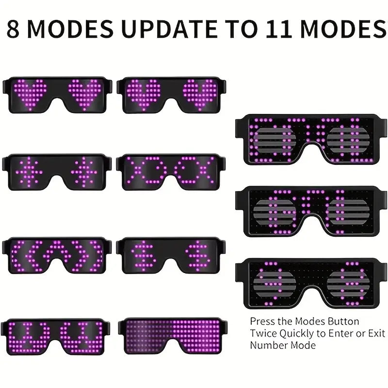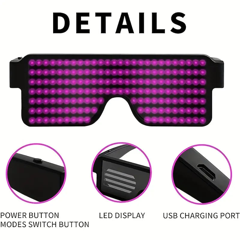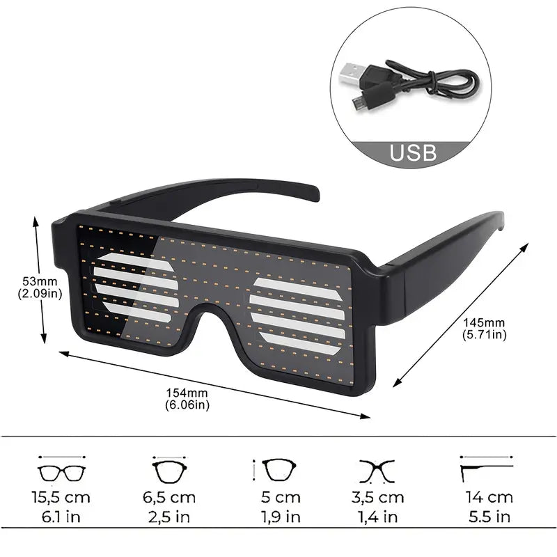 The LED Light-Up Glasses are stylish, USB-rechargeable luminous glasses designed to make you stand out at any event. Featuring 11 dynamic lighting patterns and multi-color glow effects, these glasses are perfect for parties, festivals, and celebrations. Lightweight and comfortable to wear, they add a fun and futuristic vibe to your outfit while being safe for your eyes. Ideal for Halloween, Christmas, concerts, and night events.
